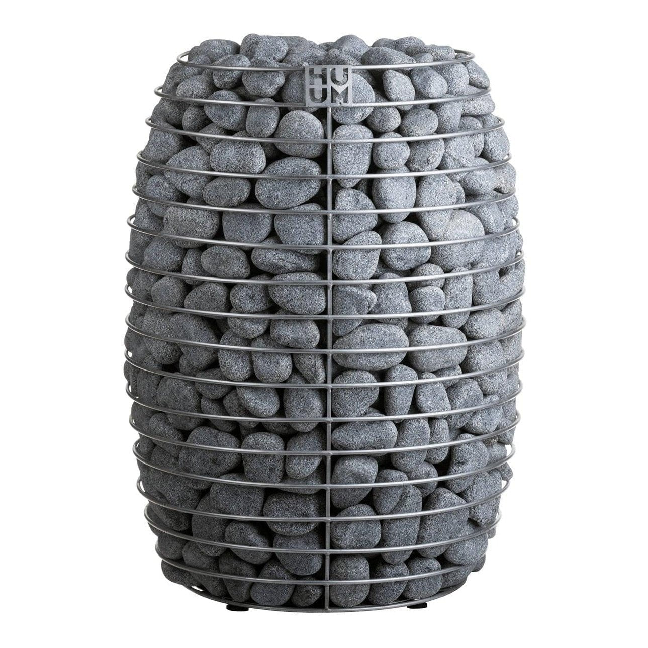 Stones are not included. HUUM recommends rounded olivine diabase stones (5–10 cm) for softer steam and a complementary design. These stones are durable, hold heat well, and are available separately. Decorative stones are not recommended.