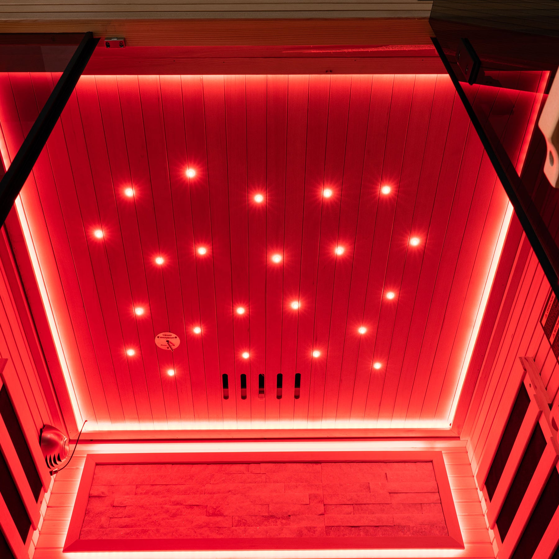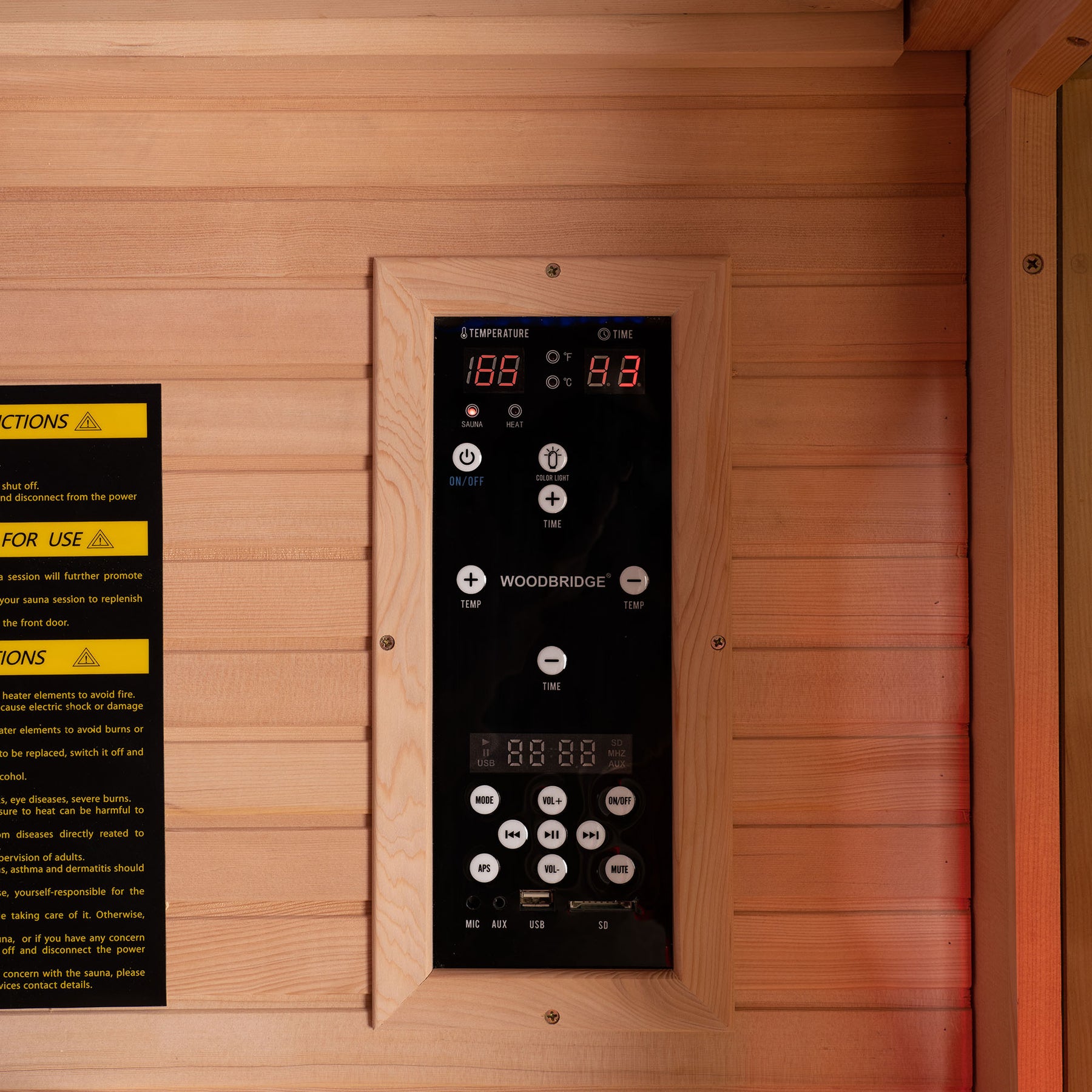 The 2-Person Infrared Sauna is built with Canadian Hemlock wood and a tempered glass door, combining durable construction with a clean, modern look. Designed for home use, it includes advanced heating technology and comfort-focused features in a space-efficient layout.