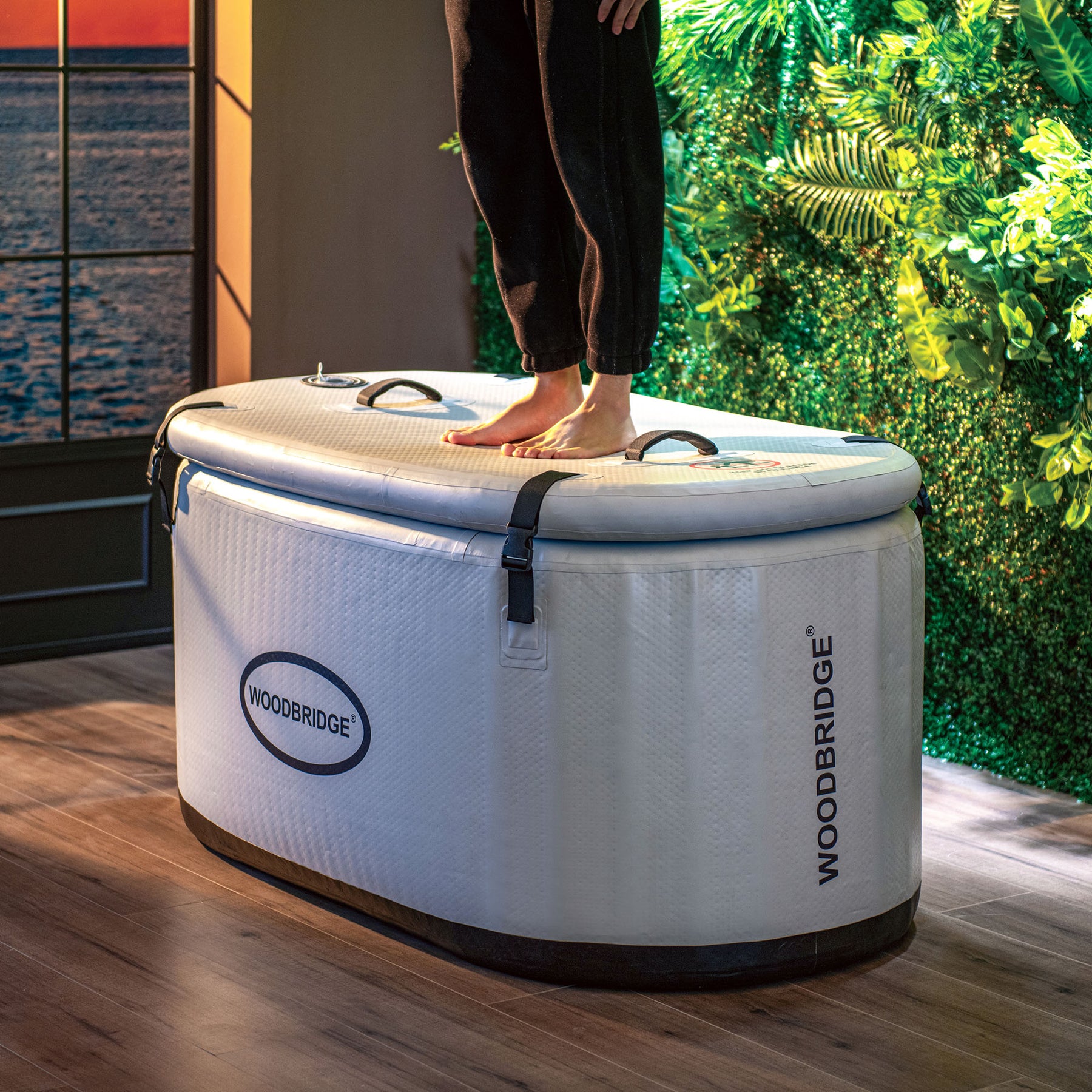 The Woodbridge Inflatable Cold Plunge is a portable water tub designed for indoor or outdoor use. Its space-saving inflatable design allows for easy setup, transport, and storage, while the integrated chiller system provides adjustable water temperature.